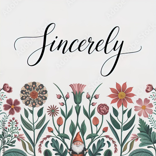 A cute logo with ornate text Sincerely, and a floral intricate illustration. On a clean white background