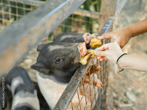 A cute pet pig with a metal cage in the garden at the farm