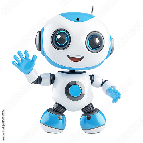 A cute robot with a friendly wave, featuring a happy expression and welcoming gesture. Its design incorporates blue and white colors, giving it a modern look
