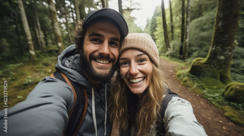 a cute romantic hetrosexual couple shooting a selfie while hiking in country in a forest in the morning. smiling and being happy together. Generative AI