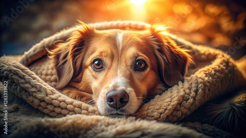 dog, puppy, blanket, cosy, soft, light, warm, cuddly, sleep, pet, animal, photo, fur, fluffy, adorable, cute, peaceful, serene, relaxing, home, comfort, happy, sweet, love, friendship, canino, companion, friends, loyal, faithful, domestic, closeup, detail, realistic, image, picture, photo, warm colors, hi-res, detailed, blurred background