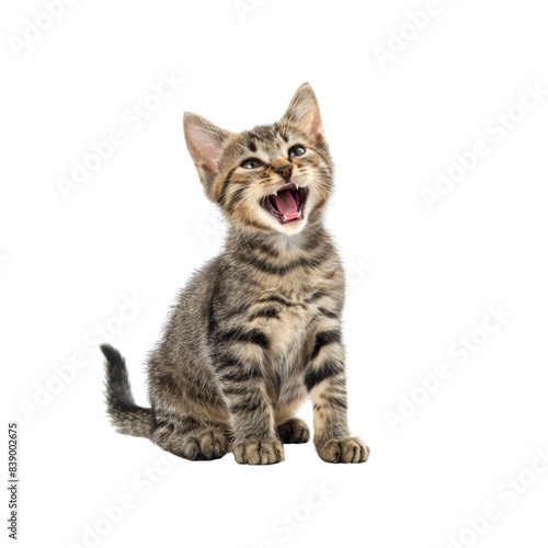 A cute, striped tabby kitten with its eyes closed and mouth open isolated on white background.
