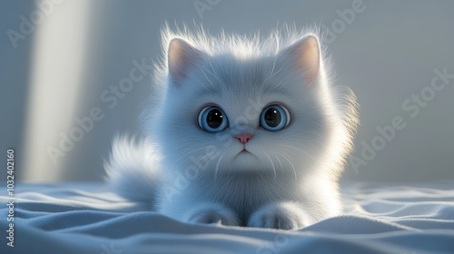 A cute white kitten with big blue eyes lies on a white bed.