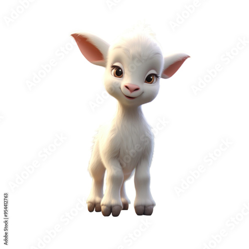 A cute, white lamb with big, brown eyes and a pink nose, standing on all four legs with a sweet expression on its face.