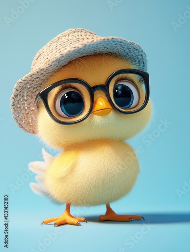 A cute yellow chick wearing glasses and a hat, standing on a blue background