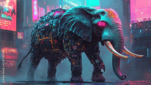 A cybernetic elephant stands in a vibrant, futuristic city street, glowing neon signs reflecting in its metallic body.