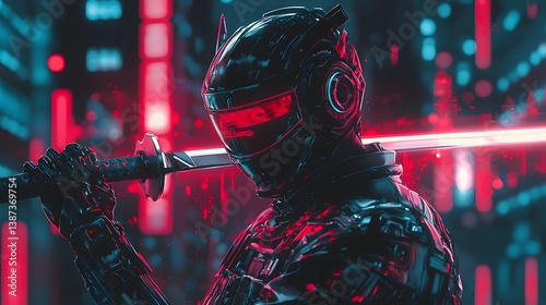 A cybernetic warrior wielding a glowing katana in a neon-lit city. Futuristic armor, deep shadows, red-blue lighting, sci-fi tech aesthetics, intense cinematic mood