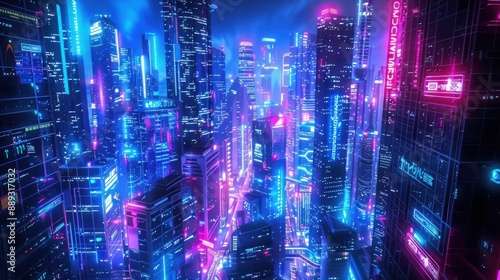 A cyberpunk background with a futuristic cityscape illuminated by vibrant neon lights in colors like electric blue, hot pink, and neon green advanced technology and holographic advertisements fill