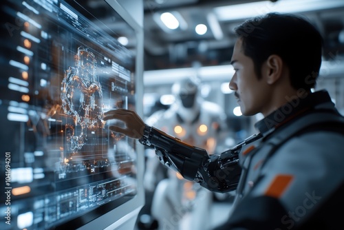 A cyborg utilizing a digital display in a high-tech environment, blending human and technological elements, symbolizing the future of innovation.