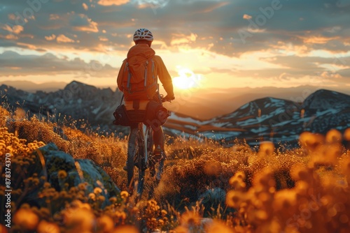 A cyclist rides through a vibrant meadow at sunset, symbolizing freedom, adventure, and the joy of outdoor activities against a breathtaking backdrop of nature and colorful flowers.