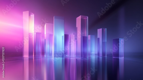 A D bar graph with tall, transparent bars in shades of blue and purple, set on a reflective surface with a soft spotlight effect