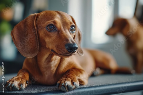 A dachshund sits on a grooming table, its fur being carefully brushed, Its ears perk up as it hears another dog nearby, Generative AI