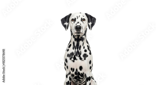 A dalmatian dog sitting and looking at the camera on transparent background