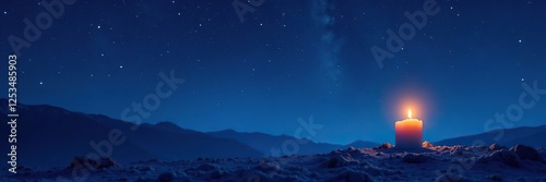 A dark blue background with twinkling stars and a lone candle flickering on the horizon, starry sky, twinkling
