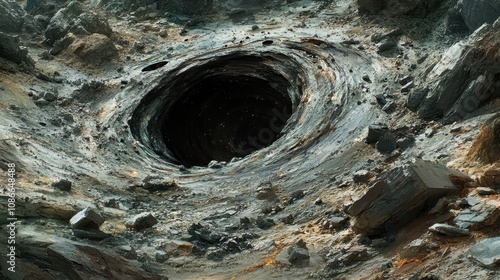 A dark, circular hole surrounded by rough, rocky terrain, suggesting depth and a rugged environment.