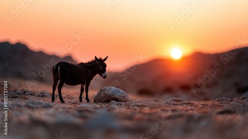 A dark donkey stands watchfully on a rocky terrain while the sun sets in the background, casting vibrant hues across the sky and highlighting the rugged landscape.