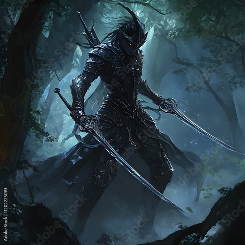 A dark elf warrior with twin swords in a shady forest