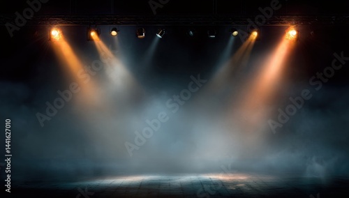 A dark, empty stage is illuminated by dramatic spotlights through a haze of smoke, creating a theatrical and mysterious atmosphere.