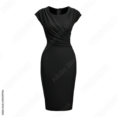 dress, midi, black, grey, fitted, draped, bodice, enclosed, short, sleeve, formal, elegant, office, work, professional, fashion, style, contemporary, modern, classic, sophisticated, waist, pleated, smooth, fabric, design, detail, silhouette, simple, slim, long, occasion, party, evening, cocktail, structured, sewn, ribbed, textured, trendy, chic, posh, smart, stylish