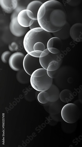 A dark grayscale image with various sizes of monochrome circles floating in space.