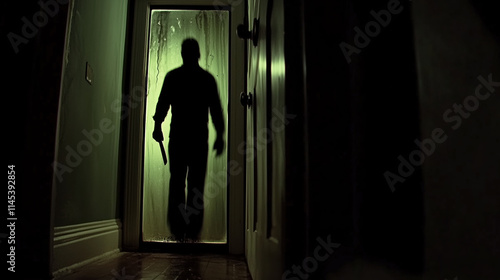 A dark room with a glass door revealing the shadowy outline of a figure holding a knife.