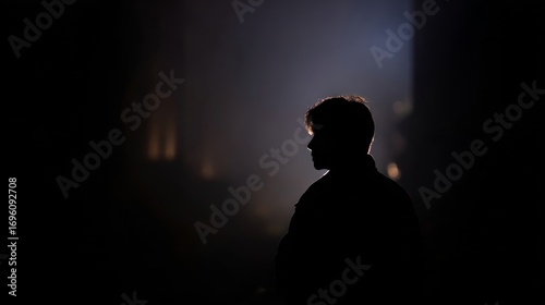 silhouette, dark, interior, ambient, light, mystery, introspection, serene, sombre, contemplation, observation, shadow, illumination, contrast, mood, space, environment, structure, pillar, dynamic, standing, facing, left, peacefulness, atmosphere, quiet, reflective, thoughtful, solitude, calm, presence, figure, human, person, setting, scene, emotional, deep