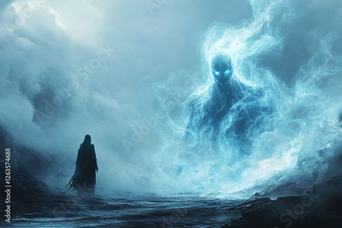 sorcerer, spirit, mystical, dark, eerie, fantasy, glowing, powerful, magic, supernatural, enchantment, witchcraft, sorcerer, mood, haunting, dreamlike, vivid colors, bewitching, surrealism, storytelling