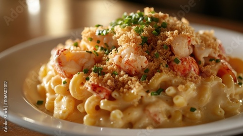 A decadent plate of lobster macaroni and cheese with chunks of tender lobster meat and a creamy cheese sauce, Macaroni and cheese plate centered, Warm diffused lighting accentuating the gooey cheese