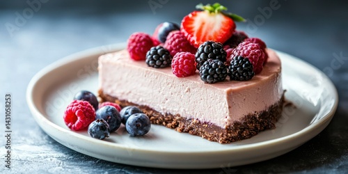 A decadent raw vegan cheesecake topped with fresh berries, served on a white ceramic plate