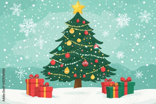 A decorated Christmas tree with colorful ornaments and a shining star on top, surrounded by gift boxes and tiny snowflakes, hand drawn, flat illustration