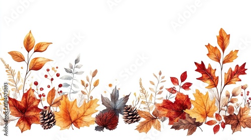 A decorative border featuring autumn leaves, pinecones, and berries in warm colors.