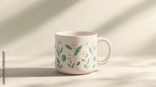 A decorative mug with floral designs, casting soft shadows in natural light.