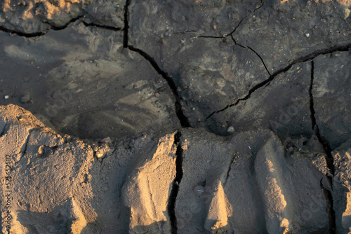 A deep car track on a Russian dirt road after rain. The imprint of car tires on the dirt. Dried mud on the roads in the village.