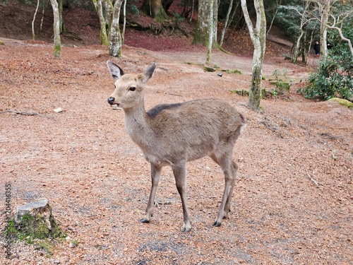 A deer standing on a forest floor covered with fallen leaves and surrounded by trees, creating a tranquil and natural woodland setting.