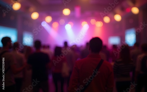 A defocused shot capturing the lively atmosphere of a social event with hanging lights and attendees. High quality