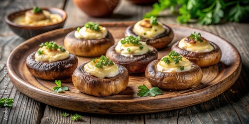 A delectable arrangement of savory mushroom caps, each meticulously filled with a creamy, cheesy mixture and garnished with fresh herbs, artfully presented on a rustic wooden platter.