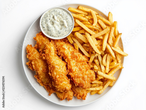 A delectable plate features crispy fried fish paired with a generous portion of golden fries and a side of creamy dipping sauce, inviting diners to savor a traditional meal. Generative AI