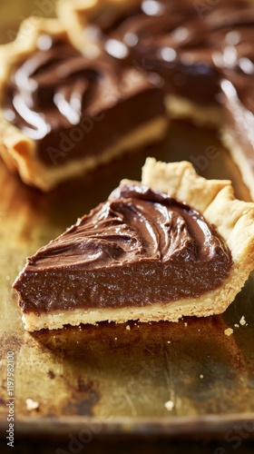 A delectable slice of rich chocolate pie, showcasing a perfect balance of flavors. A tempting treat for any occasion.