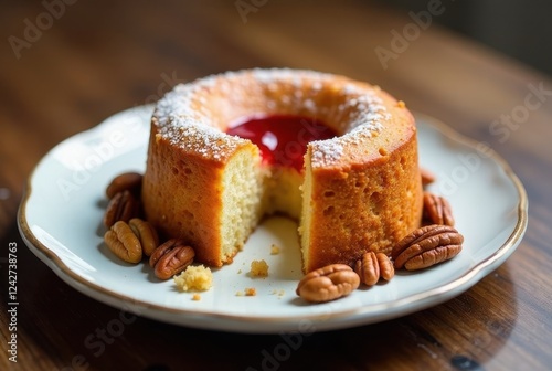A delectable, sweet treat a partially eaten, powdered-sugar-dusted cake with a vibrant fruit filling, encircled by crunchy pecans on an elegant plate.