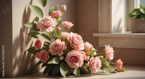 flower, arrangement, pink, rose, pastel, decorative, light, beige, still life, natural, design, bouquet, soft, shadow, leaf, composition, three-dimensional, realistic, illustration, elegant, home, interior, beautiful, colourful, bright, creative, modern, stylish, professional, vibrant, stunning, amazing, marvellously, fantastic, gorgeous, lovely, charming, attractive, impressive, spectacular, magnificent, excellent, honed, quality, premium, luxury, classic