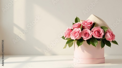 A Delicate Arrangement of Pink Roses in a Pastel Gift Box, Bathed in Soft Sunlight