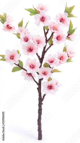 A delicate artificial cherry blossom branch with light pink flowers and vibrant green leaves, perfect for sp decorations or floral arrangements, stands isolated on a white