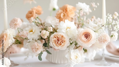 flower, bouquet, bloom, blossom, rose, white, reddening, peach, pink, flower petals, vase, floral, arrangement, delicate, soft, romantic, elegant, beauty, nature, wedding, centrepiece, table, decor, greenery, leaf, stem, bud, celebration, pastel, ivory, cream, light, background, ceramic, porcelain