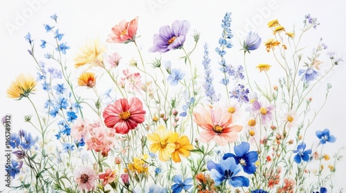 A delicate bouquet of colorful wildflowers, each petal vividly detailed, against a clean white background.