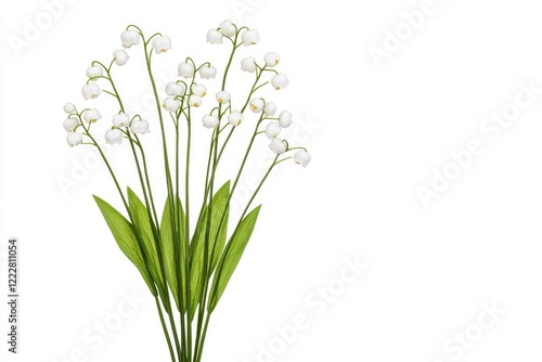 A delicate bouquet of white lily of the valley flowers with green leaves against a clean white background