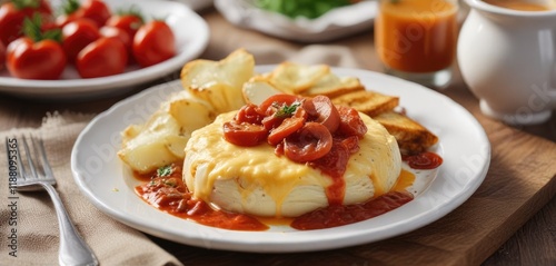 A delicate breakfast plate filled with creamy cheddar cheese, saut?ed onions, and rich tomato sauce, brunch, food presentation, onions