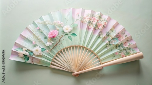 A delicate hand fan, adorned with pastel floral designs and real pressed flowers, rests elegantly against a soft green backdrop.