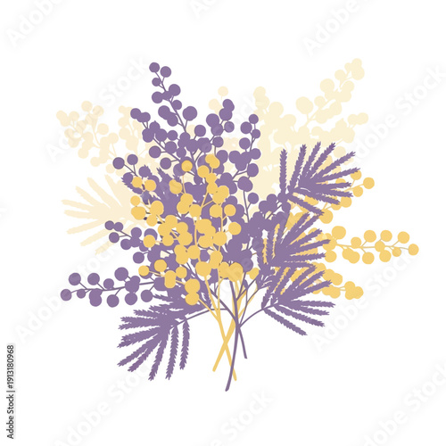flower, floral, bouquet, mimosa, plant, nature, botanical, bloom, blossom, leaf, green, yellow, purple, illustration, drawing, vector, art, design, graphic, element, decoration, ornament, spring, summer, season, beauty, delicate, soft, gentle, organic, pattern, texture, isolated, white, background, simple, minimalist, modern, contemporary, fresh, vibrant, colourful, pretty, elegant, feminine, romantic, celebration, greeting