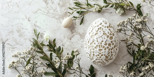 A delicate lace-inspired Easter egg template with greenery as a backdrop