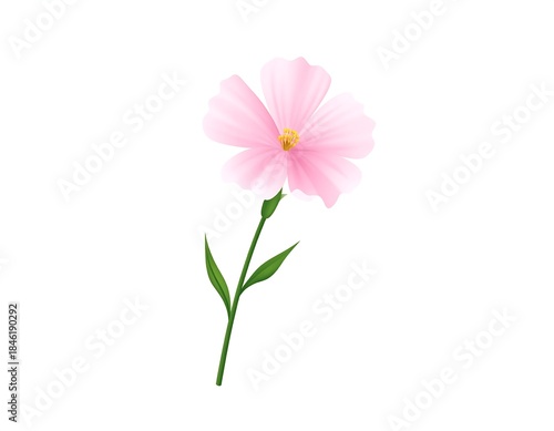 A delicate pink flower with a yellow center and a slender green stem and leaves isolated on a white background
